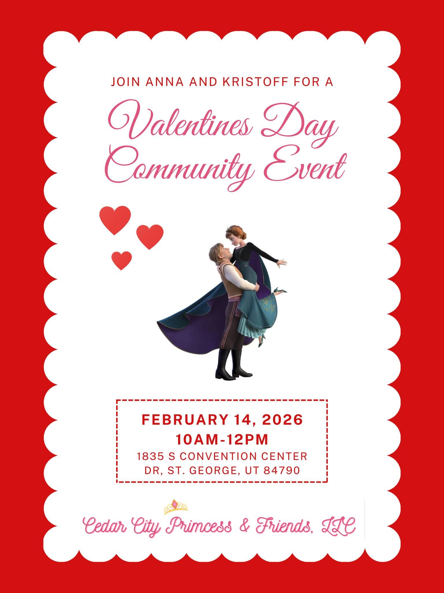 Anna and Kristoff pass out Valentine heart suckers to kids and cheer for the runners during the kid's division race! Meet and greet, photos, and game opportunities.